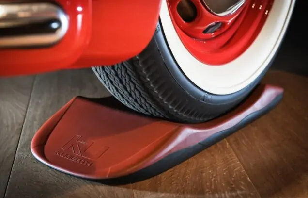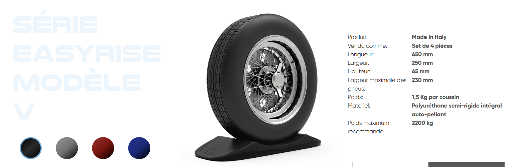 Easyrise V is a polyurethane cushion that prevents the flat spots on tyres during long stops by distributing the weight of the vehicle evenly over a large surface area. The dimensions of this cushion are specially designed to fit classic car tyres. The innovative design supports and preserves the shape of the tyre to significantly increase the contact area, distributing the weight evenly reducing the risk of flat spots and cracking. Thanks to the polyurethane composition, the cushion thermally insulates the tyres from contact with the ground.